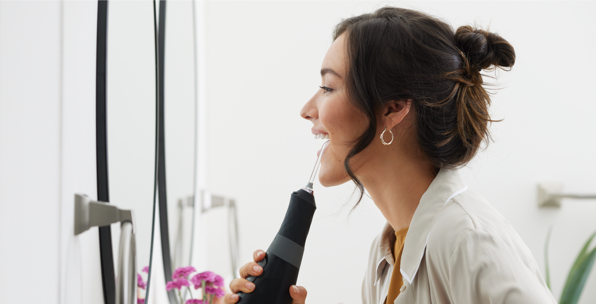 “Compact, water-resistant and cordless, this water pick has three modes and three interchangeable tips for a customizable experience.”